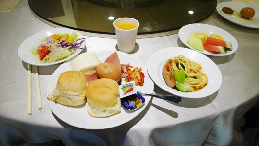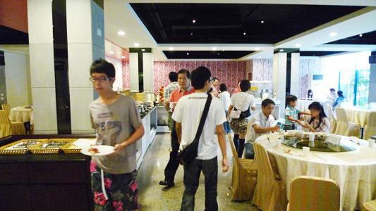 早餐在住宿的隔壁棟吃(魚池也在這裡),雖然不大,但是中西都有,算是很豐富拗。平常感覺是宴會廳,所以都是大圓桌, 不要害羞看到有空位問一下沒人就給他坐下去吧,說不定會促成一顆涼圓一段良緣溜~