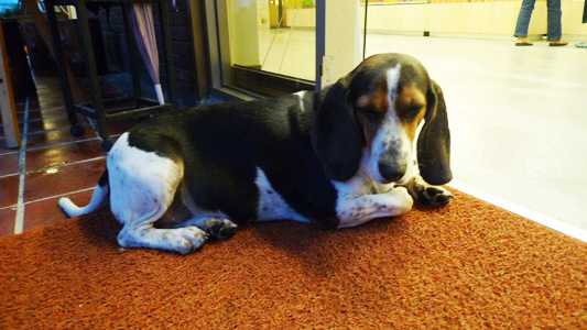 身為中華民國動物親善大使(誰?),怎麼可以忘記介紹汪汪呢?這是販賣區門口的門神米格魯(好像有點老了喏)(而且我本來以為牠是HUSH PUPPIES那種狗,不過看照片覺得應該是米格魯吧)