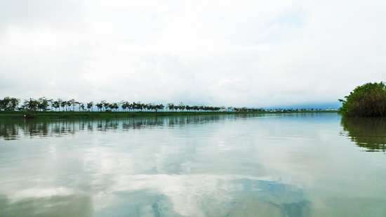 我們時間大多花在傳藝,到冬山河時已經有點晚了,加上雨一陣一陣的,就沒有租腳踏車來騎了(哀喪)。不過在搭接駁船的時候倒是拍了一張很滿意的照片,看那河面倒影真美溜!