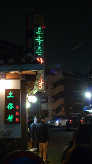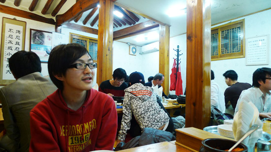 基本上旅行團會去的點,多是外國人常去或外國人專用的地方,土俗村就是其中之一。因為生意興隆的關係,買下了一整棟公寓開餐廳,就變成現在這個樣子了。裡面有一部分是傳統韓式的房間,我們三個因為一般桌椅的地方坐滿了,有幸坐到這裡來。在這種房間需要脫鞋、盤腿,地板下會加熱,所以十分暖和。但是盤腿對大多數人來說都沒辦法持久,就連我們對面的韓國女生都用很豪邁的大姊姿態蹲坐了。
