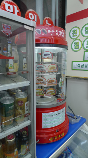 7-11 的包子機是圓柱狀的,好可愛!這裡的 7-11 連假睫毛都有賣,洗衣粉也好大一盒。竟然還有鋁箔包的燒酒……