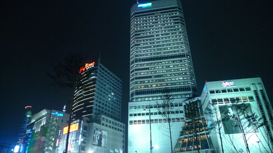 雖然吃完飯已經晚上 9 點了,我們還是繼續去本來的行程點:東大門。這裡有許多百貨、成衣批發、布料零件等等的店,最晚的店甚至開到凌晨,不管什麼時間來都有得逛。但因為只有一個小時的時間,我們只能簡單的走馬看花一下,後來我們有自由時間有再回來看,這就留待寫到那天再說囉!