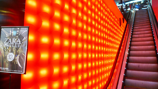 maxtyle 每個電扶梯旁的牆壁裝飾都不同,這個紅色燈的最刺眼,很像有特殊目的的Club。