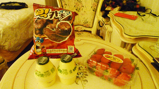 剩下的草莓最低只要 ₩2,000(約 NT$55 ),於是我們一時失心瘋就買了最便宜的草莓一盒。不過貪小便宜沒有好下場,跟安海瑟薇很正一樣是亙古不變的道理(我承認是因為我在看這個短片才這樣寫),回飯店吃才發現裡面足足爛掉一半,還好我們吃了都沒事,不知道是它爛的不夠徹底,還是我們台灣鐵胃實在是不乾不淨吃了沒病。