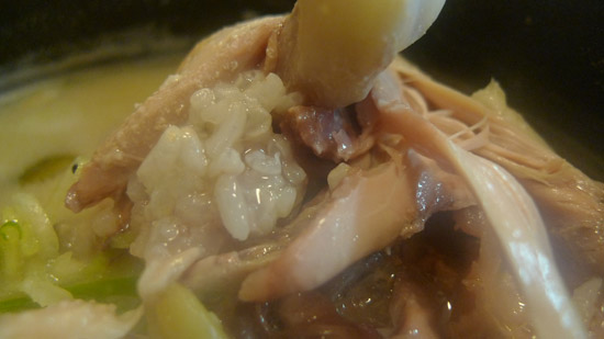 把雞雞(羞)整個剝開來,會看到裡面塞滿了糯米。雖然燉煮了很久,米粒都很團結自己變成一塊一塊,但不會爛到難以入口。厲害的是裡面放的栗子,因為帶皮,要很用力咬把肉擠出來,而且栗子本身跟鋼鐵人一樣硬……