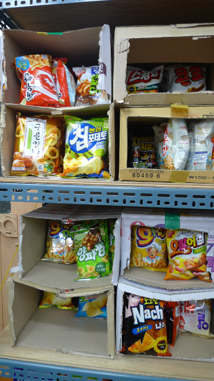 24Hours CVS 餅乾賣法超豪爽,直接進貨之後把箱子割開,塞在看起來很沒質感的架子上。orz