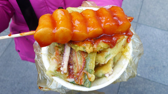 年糕串(₩3,000,約 NT$80)和魷魚煎餅(₩8,000,約 NT$220)。實在是貴到不行,但反正我們都餓了,而且我已經呈現(ㅎ_ㅎ)←這樣眼睛半閉的狀態,不吃點東西的話實在是撐不下去啊!再加上我們都想吃吃看小吃嘛。(這段很明顯就是在為自己過度的花費找藉口啊真是)年糕我們選的是比較甜的口味,真的是香 Q 帶勁啊~煎餅也很好吃,不過越底下的煎餅就越鹹,最後根本吃不完啊~"~ 另外跟這裡的阿啾媽講日文還比較通,雖然我們跟她之間還是有點障礙orz