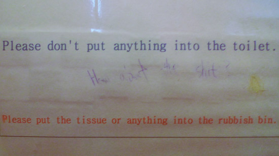 雖然東西是這麼好吃!肉是這麼香!麵是這麼冷!(什麼)但這家店最有紀念價值的東西其實出現在廁所裡啊!看到這裡的捧由們千千萬萬不要擔心,就算你在吃飯也一樣不用擔心,我絕對不會貼一些妨礙心情的畫面給各位看的(第一天那個枕頭便便不算哦)首先發現的是小可,所以我就趁上廁所的時候順便拍了一下。因為怕馬桶堵塞,所以馬桶旁貼了 "Please don't put anything into the toilet."(請勿丟任何東西到馬桶裡)。結果下面被寫了這段話: