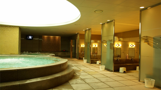 汗蒸幕玩完之後,把短袖、短褲丟到更衣室的籃子裡面之後,就可以光溜溜的去泡三溫暖了。當然基本規則「先沖澡再入池」請千萬不要忘記哦~裡面有五個池子(男生那邊,女生區應該也差不多吧),有三個是 38 度左右的體溫池(亂取的),其中兩個一紅一綠,應該有特別療效?沒有特別看清楚就是了。剩下兩個的溫度非常極端,一個 16 度、一個 43 度,整個沒有辦法接受啊~ 16 度的我還可以泡到小腿,43 度的就只能泡腳底了。對,只有腳底跟池面接觸,不然我想應該會整個燙熟吧……