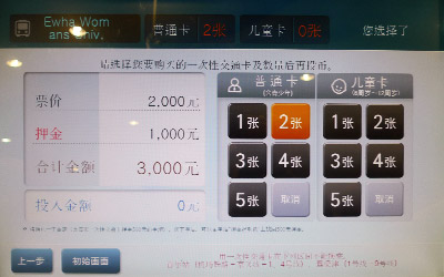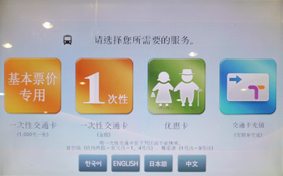 可以點選中文進行購買,所以並不難喔!比較麻煩的是站名的部份,建議先看好地鐵圖中目的地車站的編號,購買起來會比較方便。下面放上購買步驟的螢幕畫面給各位做參考: