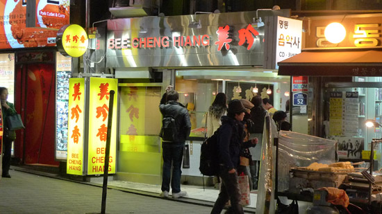 這裡很像非常大型的夜市與西門町的複合體,然後再加上一點點的信義區。走著走著隨時都可以看到小吃攤或 X 版光碟攤(沒想到韓國也有),也有比較高價位的品牌、餐廳,甚至出現了鼎泰豐跟快可立。總之,晚上的明洞五光十色、絢爛非常,逛起來確實有恍如隔世之感。(這樣連用三個成語有沒有顯得很高級?沒有嗎?)下面就用一連串的照片和圖說來介紹明洞的裡面(好色喔)吧,因為我覺得這是最好的方式,更好的方式是 3D 攝影但我辦不到,除非跟我一起出去玩的是詹姆斯柯麥隆。