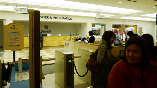 雖然是假日,可是這裡還是很多人啊!一來韓國當時還在放寒假,二來汗蒸幕就像三溫暖界的西門町一樣,年輕人也會約在這裡聚會,連情侶約會有時候也會來這裡,就連電視節目也很多在汗蒸幕拍攝。三溫暖大池子牆上的電視放的節目就是在汗蒸幕拍攝的,一堆人邊泡邊看得津津有味,甚至我覺得有的人是為了看電視去的而不是為了泡澡……還有一個阿伯在沖澡的地方對著鏡子打泰拳、一直挺下半身,還繞全場跑來跑去,俗在是好驚人諾。