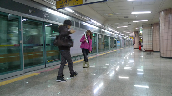 碎嘴一句,韓國的地鐵站實在太詭異了,你在入站之前就要先看好要搭哪邊月台的車,如果去錯邊可是要上樓重新刷卡的……也許是為了疏散不同方向的乘客吧,不過如果朋友臨時改約地點,就不是直接走到對面月台那麼方便惹。