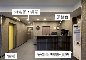 客房樓層(2~9F)都有盥洗間(4個洗手台)和廁所,洗澡則集中在一樓,分為浴場和淋浴間兩種,都有提供沐浴乳、洗髮精、潤絲精和吹風機。
