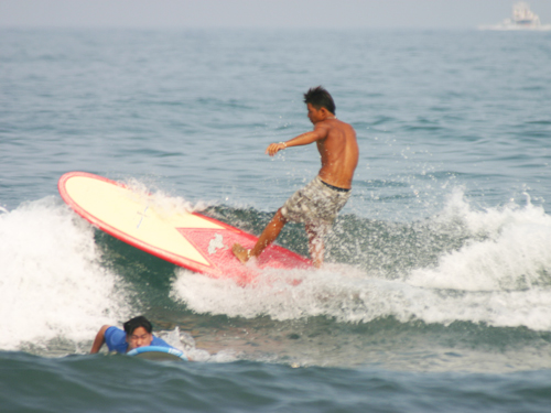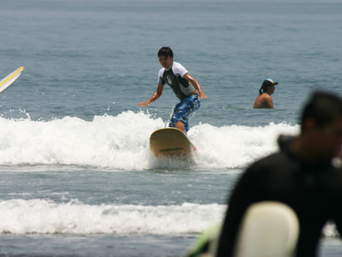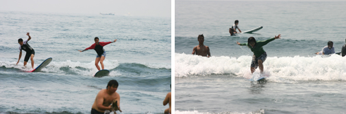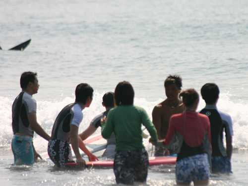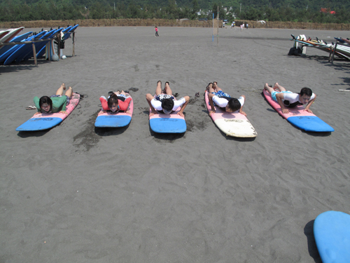 在大家熟悉基本知識後,就可以下水試試看了。首先是學習越浪的技巧,也就是在海浪打來時,讓衝浪板前端翹起,才不會連人帶板被沖走。然後在無浪時將板頭轉向海岸,學習上板的感覺(畢竟在海中上板跟在陸地上是差很多低),還有划水的力道與速度。上午的練習由教練輔助,試著搭浪起乘。雖然剛開始不太順利,不過最後還是有站起來啦!哇哈哈哈